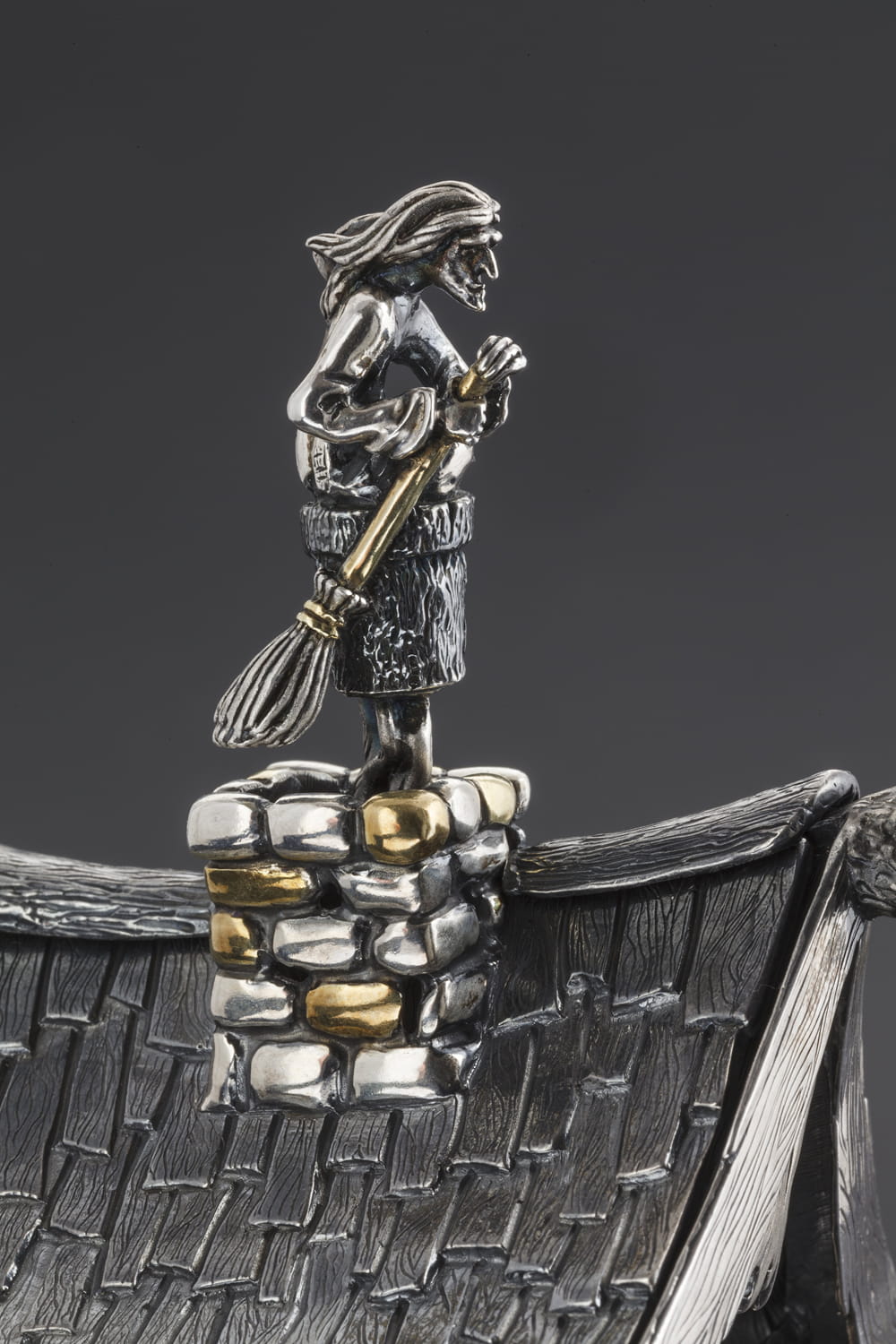 Весна — прекрасное время года. Природа просыпается, так и хочется в лес... А там — сказки живут. И вот уже на вековой сосне оказался домик на курьих ножках — такие сейчас охотники-лабазы строят, чтобы удобнее было зверя поджидать да припасы для непредвиденных случаев держать. А в древности жили в таких избушках старушки — ведуньи, травы ведали, людей лечили да советы мудрые давали. Вот и копилась мудрость в избушке, а мудрость у нас принято называть «соль земли русской». Так и родилась на «Русском серебре» солонка «Избушка на курьих ножках».